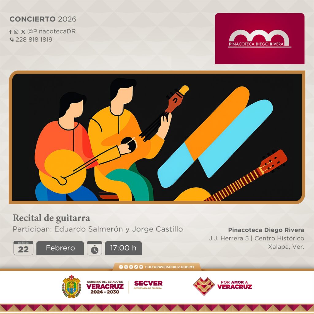 El domingo 22 de febrero, a las 17:00 horas, se llevará a cabo un recital de guitarra clásica a cargo de los músicos Eduardo Salmerón y Jorge Castillo, quienes ofrecerán un programa musical apto para todo público.Conoce más información sobre estas y otras actividades del recinto a través de las redes sociales de la @PinacotecaDR. Sigue la cuenta oficial de la @SECVERoficial para conocer todas las actividades que confirman por qué #VeracruzEstáDeModa.