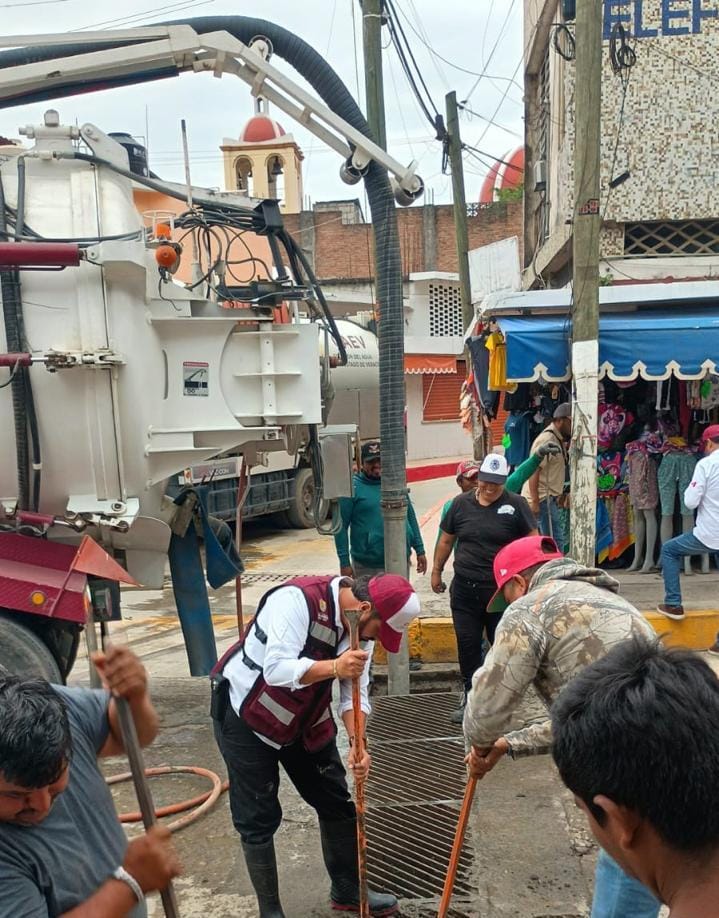 Personal técnico especializado trabaja con equipo operativo en labores de desazolve de la infraestructura pluvial, lo que permite el adecuado desfogue del agua, para ello emplean tres equipos tipo vactor, una pipa y diversas herramientas de apoyo, a fin de agilizar la limpieza y atención de la zona.