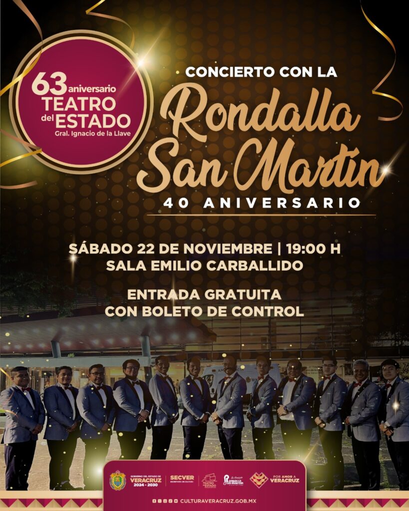 Xalapa, Ver., miércoles 19 de noviembre de 2025.- La Secretaría de Cultura de Veracruz (SECVER) invita al concierto que ofrecerá la Rondalla San Martín el sábado 22 de noviembre a las 19:00 horas en la Sala Emilio Carballido del Teatro del Estado General Ignacio de la Llave, como parte de la celebración del 63° aniversario de este recinto cultural. La entrada es gratuita con boleto de control.