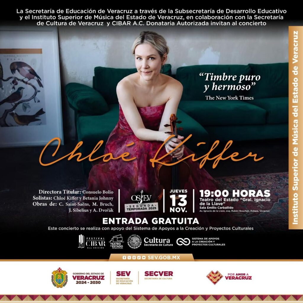 Xalapa, Ver., jueves 13 de noviembre de 2025.– La Secretaría de Educación de Veracruz (SEV) invita al concierto de la segunda temporada 2025 de la Orquesta Sinfónica Juvenil del Estado de Veracruz (OSJEV), que contará con la participación especial de la reconocida violinista internacional Chloé Kiffer, elogiada por The New York Times por su timbre puro y hermoso.