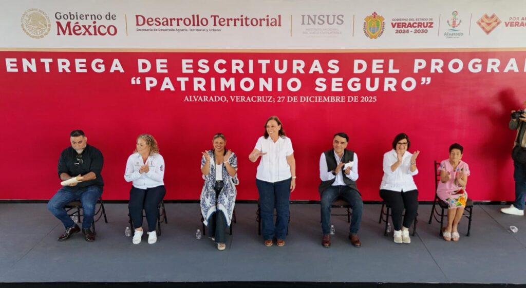 Alvarado, Ver., sábado 27 de diciembre de 2025.– “No es un tema menor entregar una propiedad legalmente; es hacer justicia social y dar tranquilidad a las familias”, afirmó la gobernadora Rocío Nahle García al encabezar en Alvarado la entrega de 336 escrituras del programa Patrimonio Seguro, en coordinación con el Instituto Nacional del Suelo Sustentable (INSUS).
