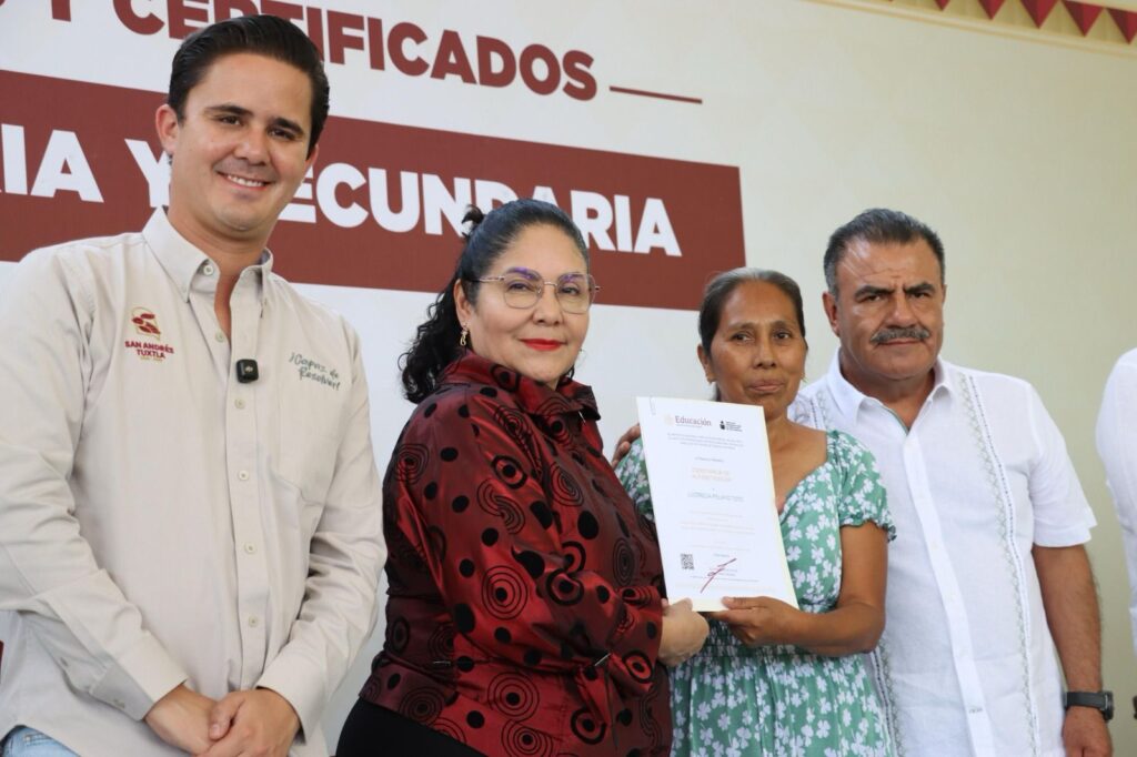 San Andrés Tuxtla, Ver., jueves 16 de abril de 2026.- Como parte de las acciones para reducir el rezago educativo, la Secretaría de Educación de Veracruz (SEV) entregó 414 constancias de alfabetización, así como 10 certificados de primaria y 10 de secundaria a personas mayores de 15 años que concluyeron su educación básica.