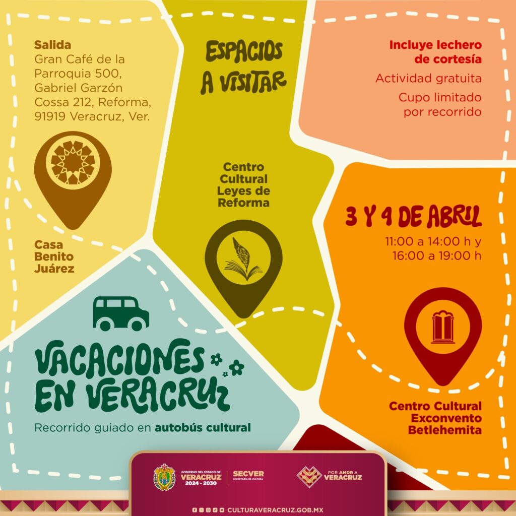 Xalapa, Ver., sábado 04 de abril de 2026.- La Secretaría de Cultura de Veracruz (SECVER) invita a disfrutar del Cultura Bus, un recorrido guiado gratuito por algunos de los recintos históricos más emblemáticos del puerto de Veracruz, el día de hoy en dos horarios: de 11:00 a 14:00 horas y de 16:00 a 19:00 horas.