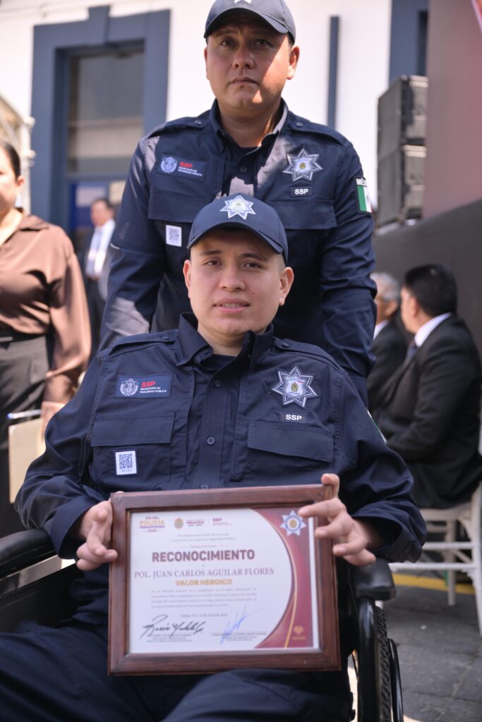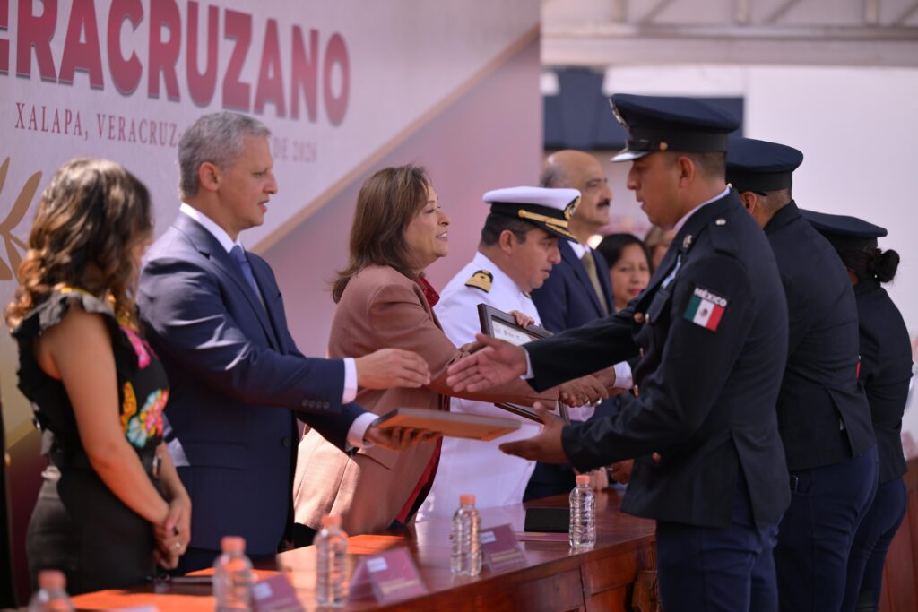 La Mandataria subrayó que el Día del Policía Veracruzano no se limita a un acto protocolario, sino que refleja el esfuerzo cotidiano de quienes sirven a Veracruz, “mi agradecimiento profundo a los policías, es un reconocimiento de un día pero realmente es el trabajo que hacen los 365 días del año”, afirmó durante la entrega de condecoraciones a diversas áreas operativas.En este contexto, anunció acciones para fortalecer a la corporación, entre ellas un incremento del 15 por ciento en salario y prestaciones; una inversión superior a un millón de pesos en becas semestrales para hijas e hijos de policías que cursan la universidad; la incorporación de 82 nuevas patrullas y la adquisición de cuatro helicópteros para reforzar la vigilancia; así como la construcción del C5 en Coatzacoalcos.Finalmente, reiteró que su administración trabaja de manera coordinada con la corporación para consolidar la paz y erradicar la violencia, al señalar que la tranquilidad de las y los veracruzanos está por encima de cualquier conducta antisocial.