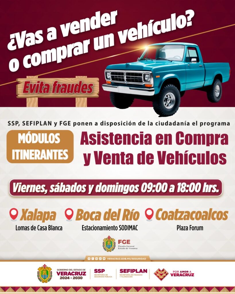 Xalapa, Ver., jueves 09 de abril de 2026.– Con el propósito de fortalecer la seguridad patrimonial de la ciudadanía y prevenir el robo y/o fraude en la compra-venta de vehículos, el Gobierno del Estado, a través de las Secretarías de Seguridad Pública y Finanzas y Planeación, en coordinación con la Fiscalía General del Estado, implementará un programa que consta de módulos itinerantes de asesoría y verificación vehicular.