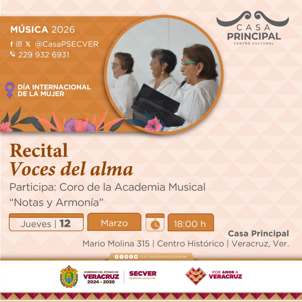 Xalapa, Ver., martes 10 de marzo de 2026.- La Secretaría de Cultura de Veracruz (SECVER) invita al público en general al recital del Coro de Mujeres Voces del Alma, que se efectuará este jueves a las 18:00 horas, en el recinto cultural Casa Principal, en Veracruz, en el marco del Día Internacional de la Mujer.