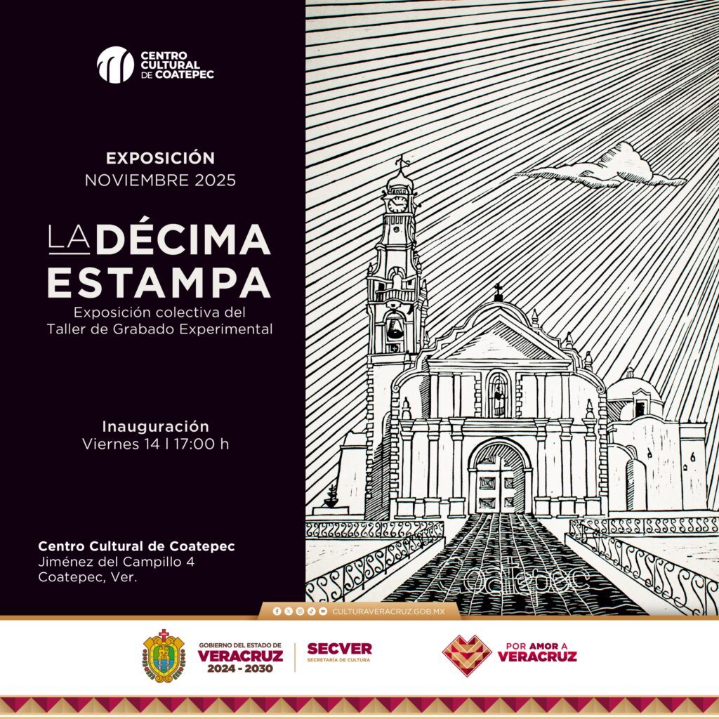 Xalapa, Ver., jueves 13 de noviembre de 2025.- La Secretaría de Cultura de Veracruz (SECVER) invita al público en general a la inauguración de la exposición La décima estampa, que se llevará a cabo en el Centro cultural del Coatepec, mañana a las 17:00 horas. La entra es gratuita.