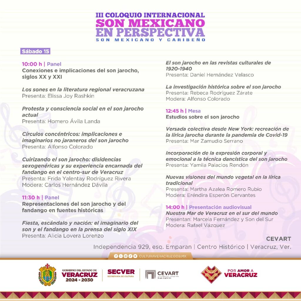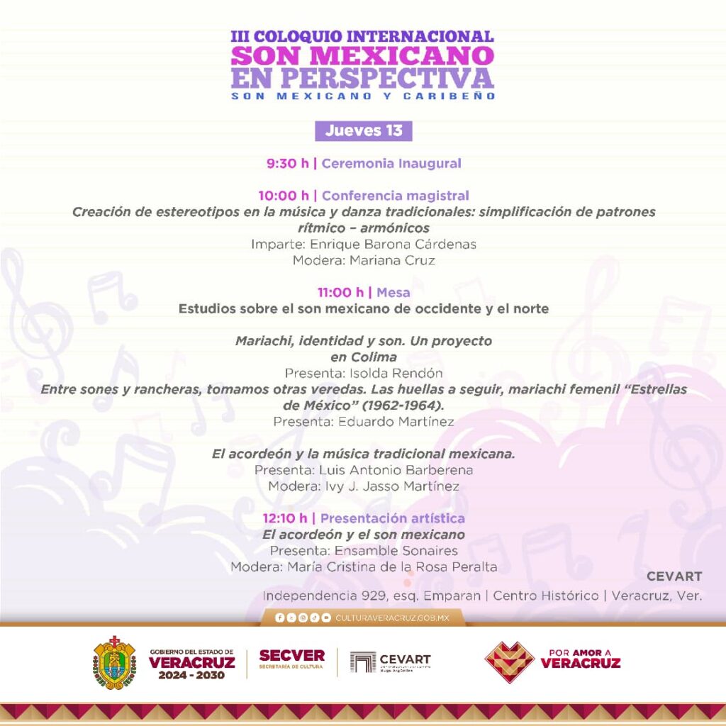 Xalapa, Ver., jueves 13 de noviembre de 2025.- La Secretaría de Cultura de Veracruz (SECVER) invita al público a participar en las actividades del III Coloquio Internacional Son mexicano en Perspectiva, que se desarrollan en el Centro Veracruzano de las Artes (CEVART) Hugo Argüelles, en el puerto de Veracruz.