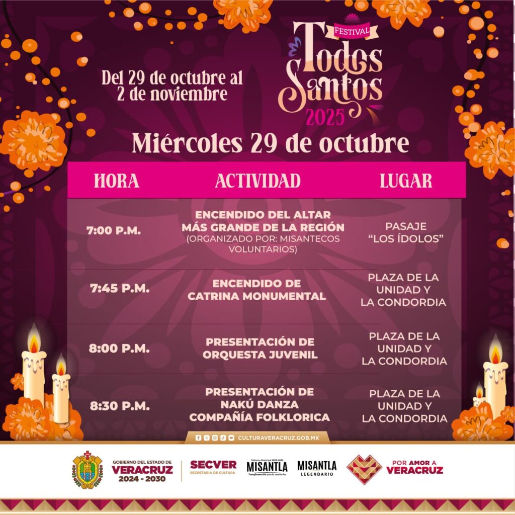 Xalapa, Ver., sábado 25 de octubre de 2025.– La Secretaría de Cultura de Veracruz (SECVER) invita a la inauguración de la Catrina Monumental el próximo 29 de octubre a las 19:45 horas, en la Plaza de la Unidad y la Concordia, en Misantla. La entrada es gratuita.