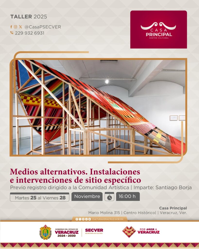 Xalapa, Ver., sábado 22 de noviembre de 2025.-La Secretaría de Cultura de Veracruz (SECVER) invita al público interesado en el arte contemporáneo a participar en el taller teórico-práctico Medios Alternativos. Instalaciones e intervenciones de sitio específico, que se realizará del 25 al 28 de noviembre, en horario de 17:00 a 20:00 horas, en el Centro Cultural Casa Principal, en el puerto de Veracruz. El cupo es limitado.