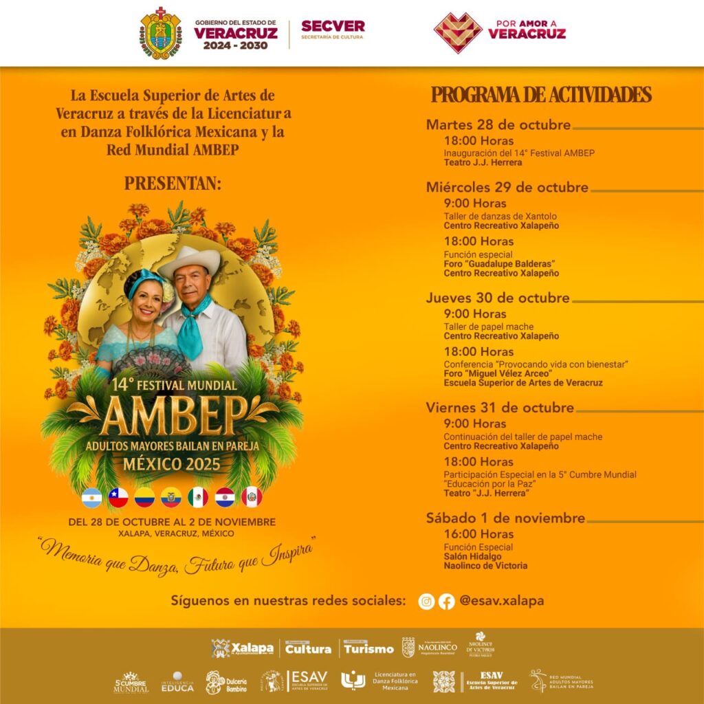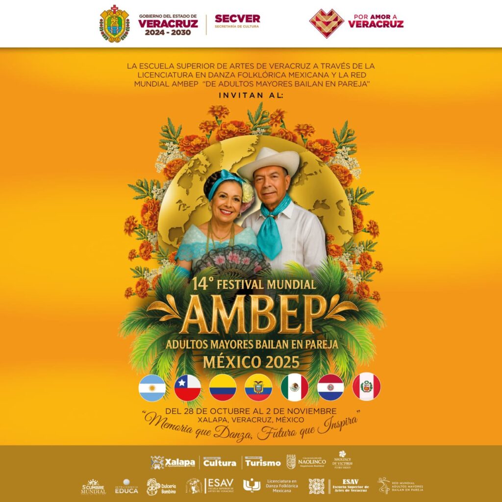 Xalapa, Ver., viernes 24 de octubre de 2025.- La Secretaría de Cultura de Veracruz (SECVER), en coordinación con la Escuela Superior de Artes de Veracruz (ESAV), el Ayuntamiento de Xalapa y el Ayuntamiento de Naolinco, invita a las actividades del 14º Festival Mundial AMBEP “Adultos Mayores Bailan en Pareja” que se llevará a cabo del martes 28 al domingo 2 de noviembre.