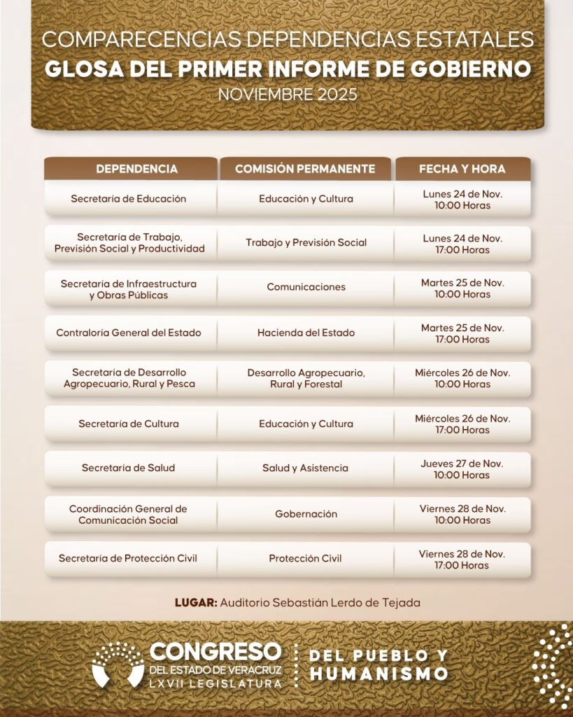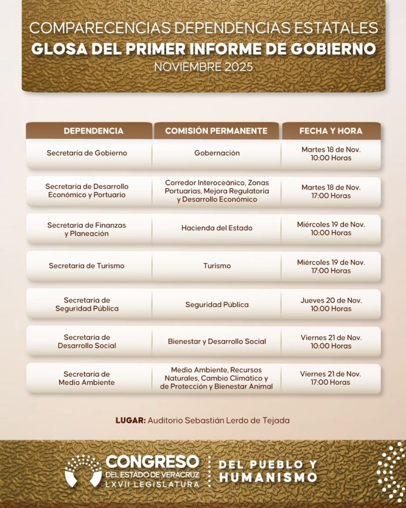 Xalapa, Ver., 06 de noviembre de 2025.- Con motivo de la Glosa del Primer Informe de Gobierno sobre el estado que guarda la Administración Pública Estatal, el Pleno de la LXVII Legislatura del estado aprobó el calendario de comparecencias de las secretarias y los secretarios de despacho o equivalentes del Poder Ejecutivo estatal, cuyo periodo abarcará del martes 18 al viernes 28 de noviembre de la presente anualidad.