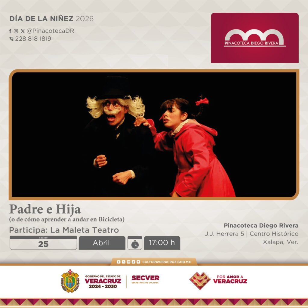 Xalapa, Ver., jueves 23 de abril de 2026.- La Secretaría de Cultura de Veracruz invita a la puesta esc1énica Padre e hija (o de cómo aprender a andar en bicicleta), a cargo de la compañía La Maleta Teatro, que se presentará este sábado, a las 17:00 horas, en la Pinacoteca Diego Rivera, en el marco del Día de las Infancias. La entrada es gratuita.