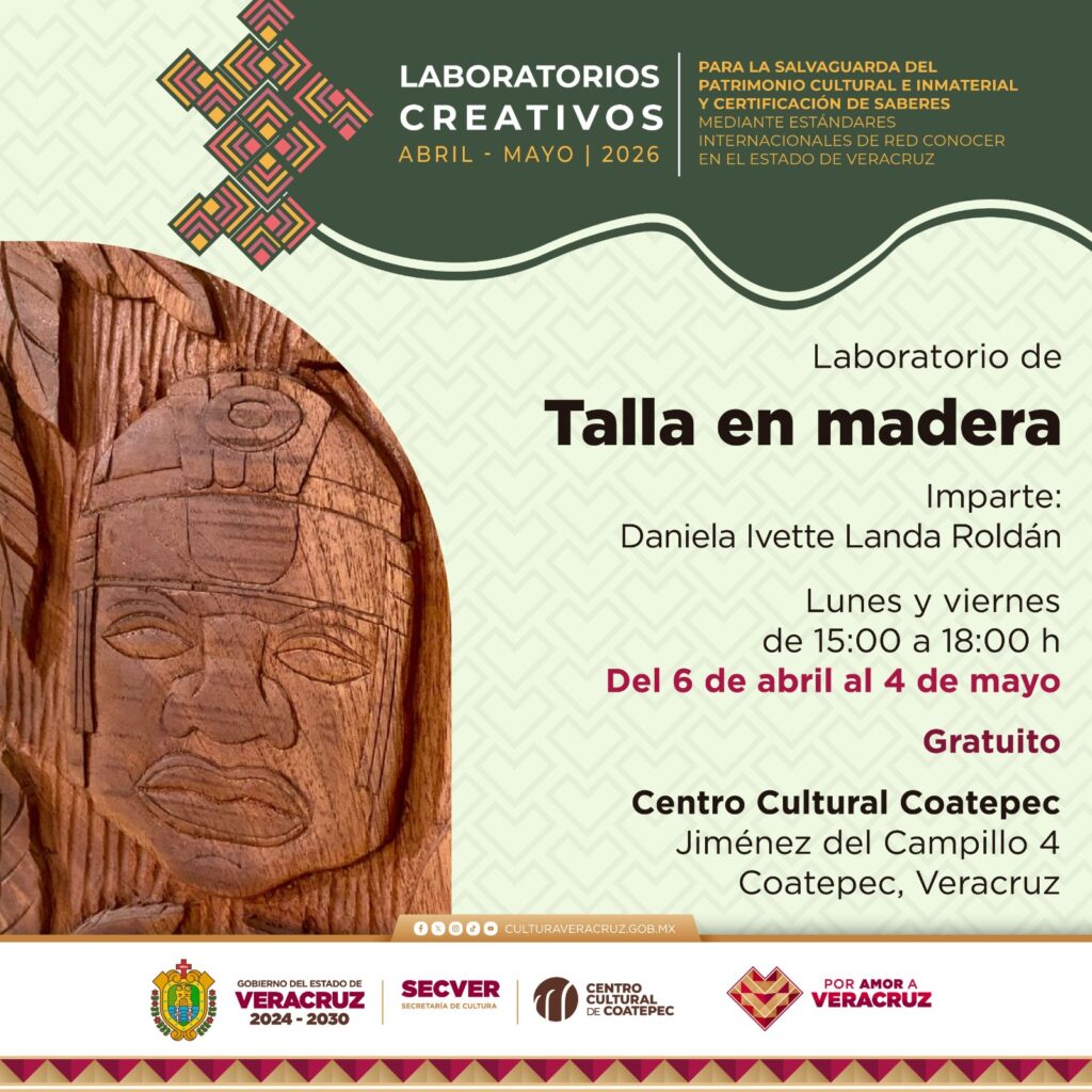 Xalapa, Ver., jueves 09 de abril de 2026.- La Secretaría de Cultura de Veracruz (SECVER) invita a participar en los Laboratorios Creativos de Talla en madera, iniciativa gratuita que se desarrolla de abril a noviembre en distintas regiones del estado, para salvaguardar el patrimonio cultural inmaterial en riesgo.