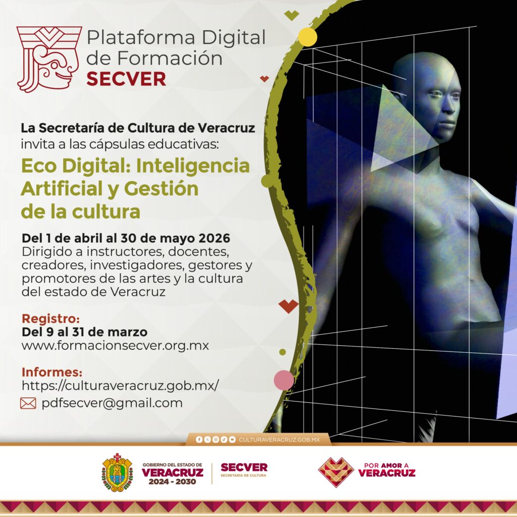 Xalapa, Ver., miércoles 11 de marzo de 2026.– La Secretaría de Cultura de Veracruz (SECVER) invita al público a participar en la serie de cápsulas educativas Eco Digital: Inteligencia Artificial y Gestión de la Cultura 2026, que se transmitirá del 07 de abril al 30 de mayo a través de la Plataforma Digital de Formación SECVER, disponible en el portal https://www.formacionsecver.org.mx/.