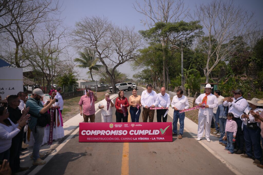 Posteriormente, la Gobernadora encabezó la inauguración del camino La Víbora–La Tuna, en el municipio de Tlalixcoyan, cuya reconstrucción comprendió 6.7 kilómetros con un ancho promedio de cinco metros, donde se realizó la construcción de base hidráulica, colocación de carpeta asfáltica, señalamiento horizontal y vertical, así como construcción de cunetas.