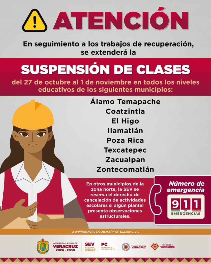 Xalapa, Ver., viernes 24 de octubre de 2025.- En seguimiento a los trabajos de recuperación en la zona norte, el Comité Estatal de Emergencias, en coordinación con la Secretaría de Educación de Veracruz (SEV), informa que se extiende la suspensión de clases y actividades escolares en todos los niveles educativos de ocho municipios, del 27 de octubre al 01 de noviembre: