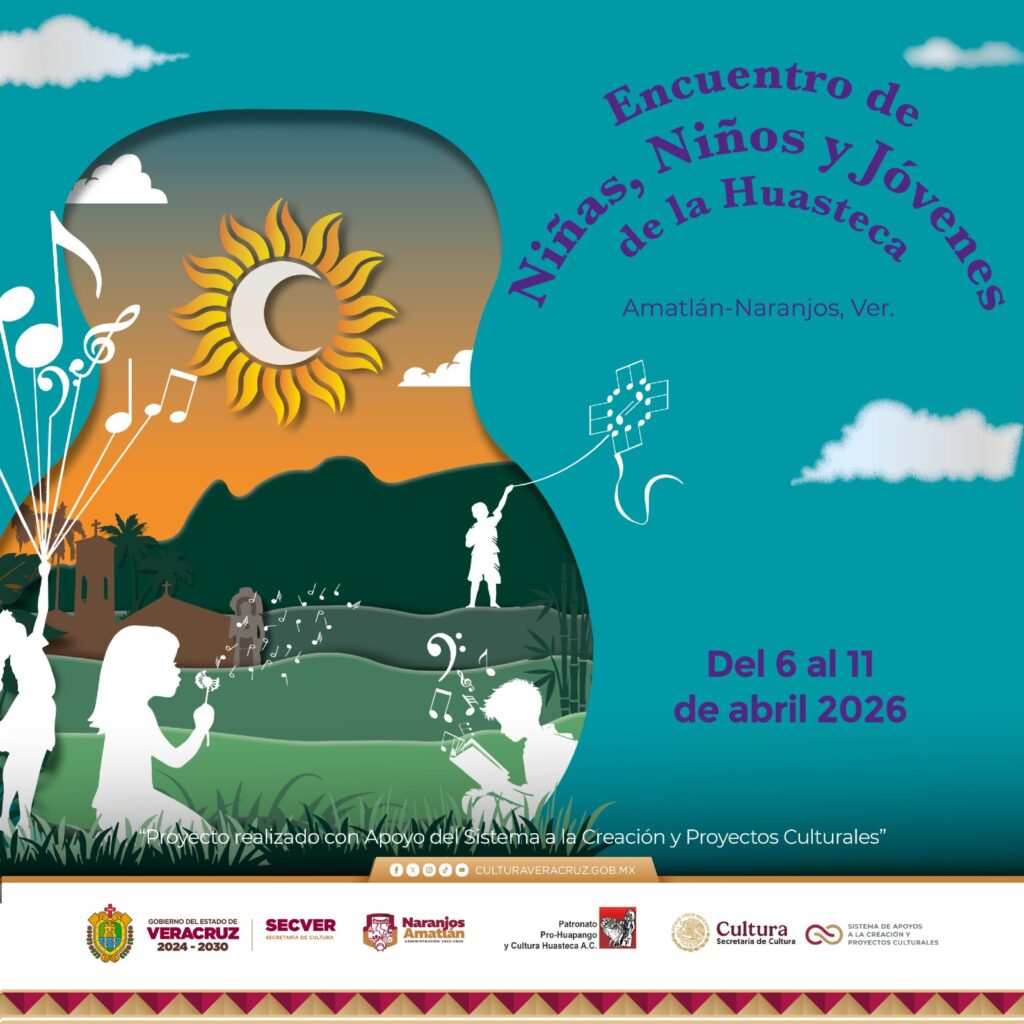 Xalapa, Ver., miércoles 01 de abril de 2026.- La Secretaría de Cultura de Veracruz (SECVER) invita al Encuentro de Niñas, Niños y Jóvenes de la Huasteca, del 06 al 11 de abril en el municipio de Naranjos Amatlán. La entrada es libre.