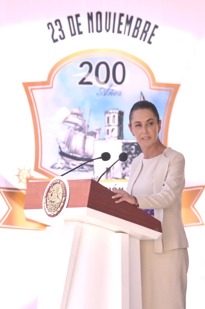 Veracruz, Ver., domingo 23 de noviembre de 2025.- Desde el Cuatro veces Heroico puerto de Veracruz y el Fuerte de San Juan de Ulúa, símbolos de la defensa nacional, la gobernadora Rocío Nahle García recibió a la presidenta Claudia Sheinbaum Pardo y al secretario de Marina, Raymundo Pedro Morales Ángeles, para conmemorar el Bicentenario de la Consolidación de la Independencia en la Mar y el Día de la Armada de México.